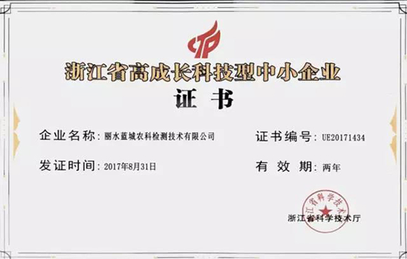克日,,,,浙江省科技厅宣布了2017年度浙江省高生长科技型中小企业名单,,,,Z6尊龙凯时子公司丽水Z6尊龙凯时农科检测手艺有限公司(以下简称“丽水Z6尊龙凯时检测”)榜上著名。。。。。。
